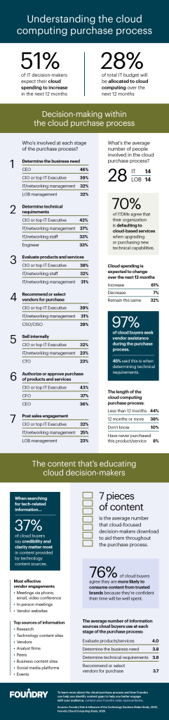 This infographic brings together data from Foundry’s Cloud Computing study and Role & Influence study to share insight into the specific cloud computing purchase process. Below you’ll learn about the types of purchases being made and whether cloud buyers seek new or existing vendors, the content types and information sources relied upon by cloud buyers, and who is involved in each stage of the cloud computing purchase process.